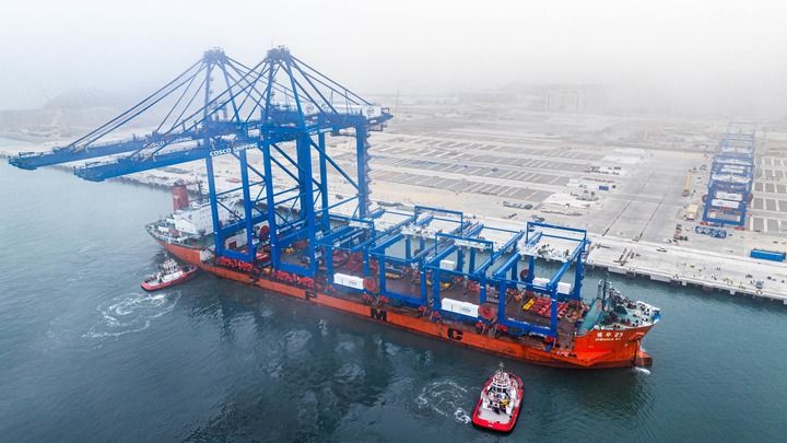 ??6月27日,岸邊集裝箱起重機和軌道吊運抵秘魯錢凱港。新華社發(fā)(上海振華重工供圖)